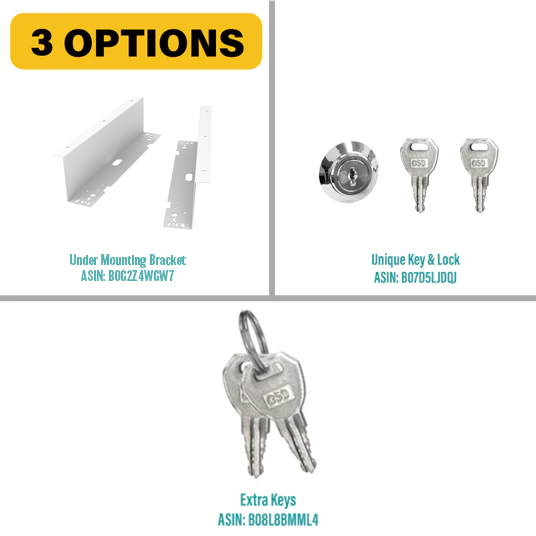 - 🔑 Additional Accessories: Extra keys (Amazon ASIN: B08L8BMML4), Unique Key and Lock (Amazon ASIN: B07D5LJDQJ), and Under Counter Mounting Metal Bracket (Amazon ASIN: B07PXGV3YY) are available if needed.
