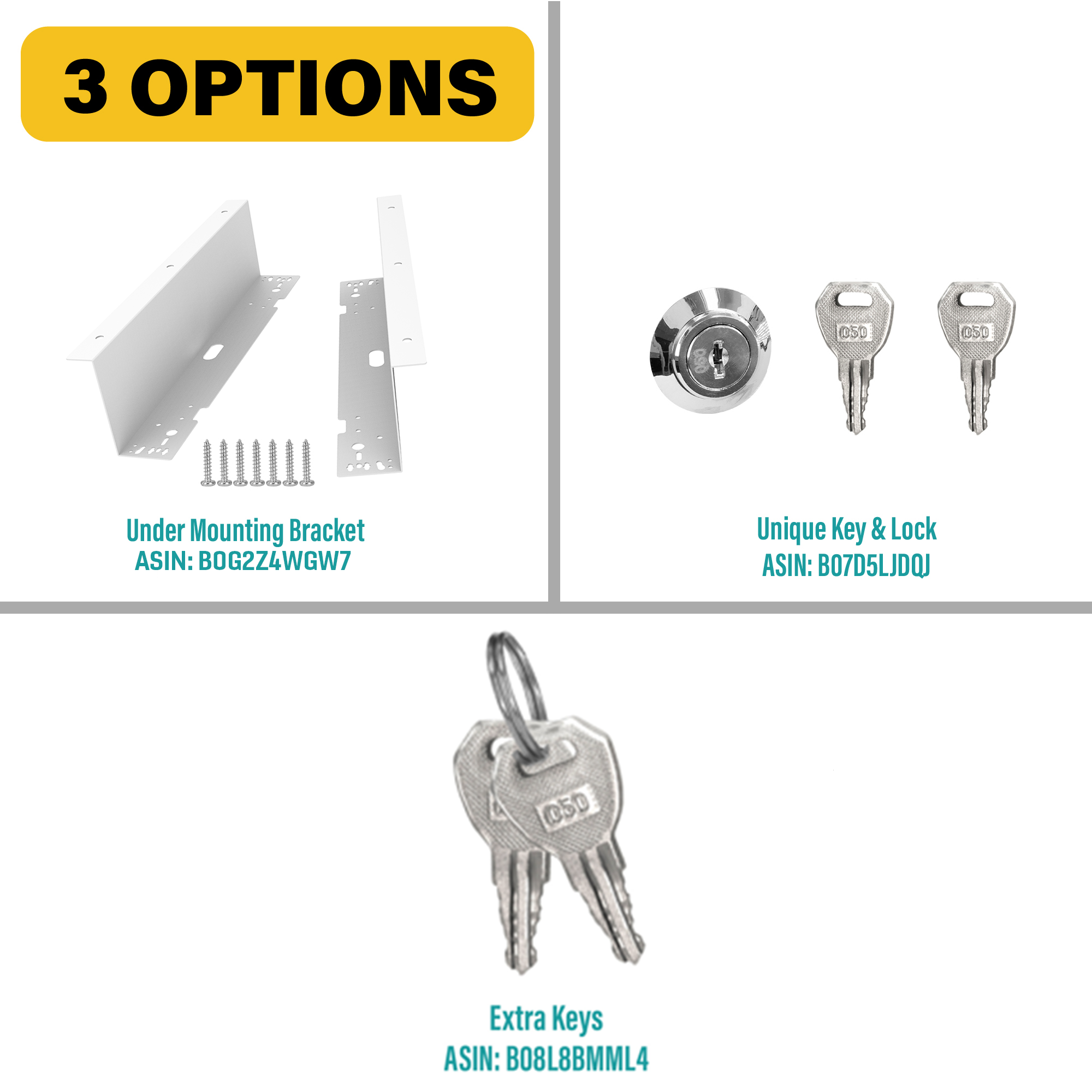 - 🔑 Additional Accessories: Extra keys (Amazon ASIN: B08L8BMML4), Unique Key and Lock (Amazon ASIN: B07D5LJDQJ), and Under Counter Mounting Metal Bracket (Amazon ASIN: B01BHFQJFG) are available if needed.