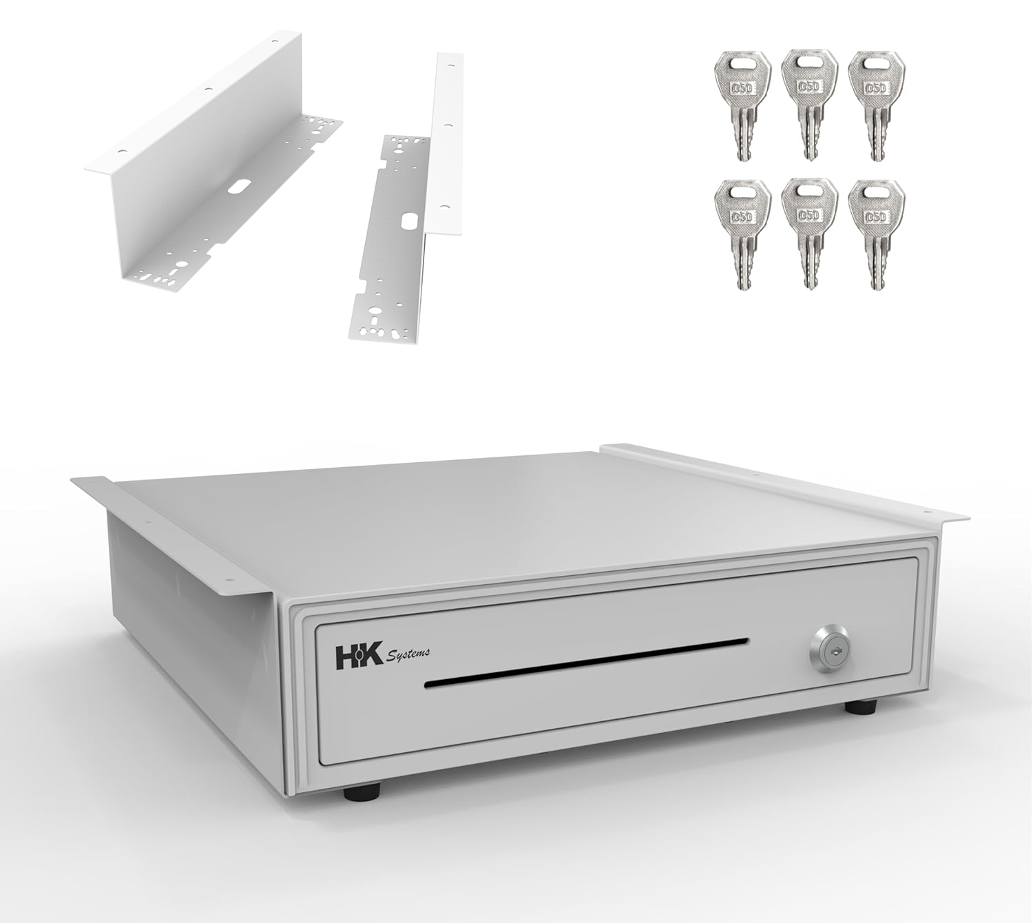 Economical Heavy Duty Compact 16" White POS Cash Drawer with 5 Bill/5 Coin, Removable Coin Compartment, 24V, RJ11, Single Large Media Slot with Under Counter Mounting Metal bracket
