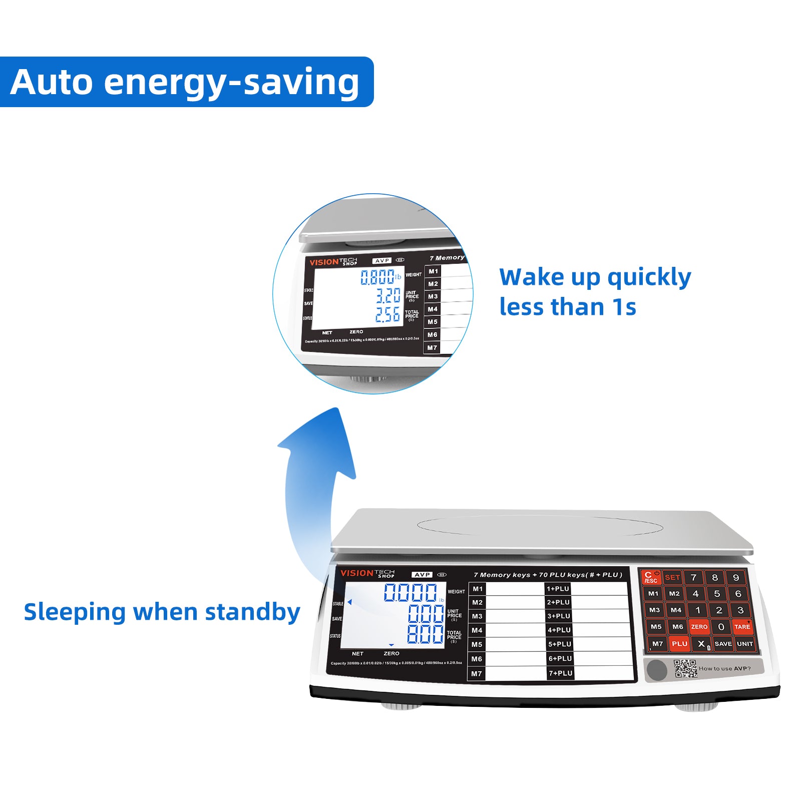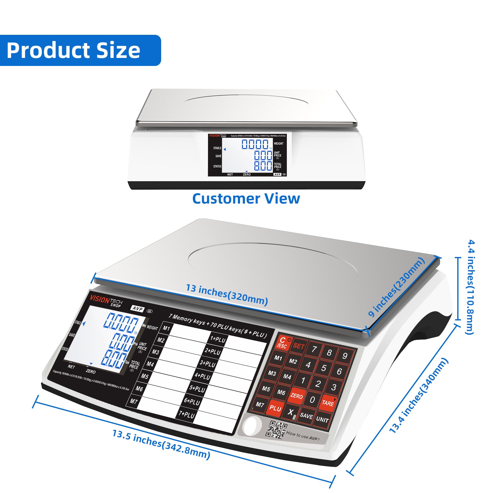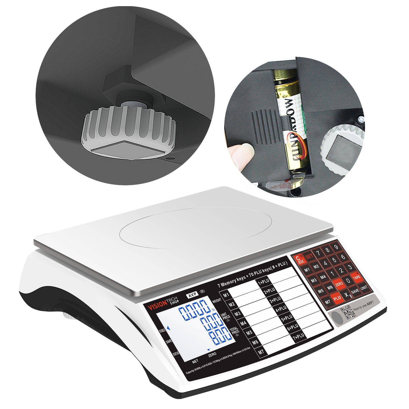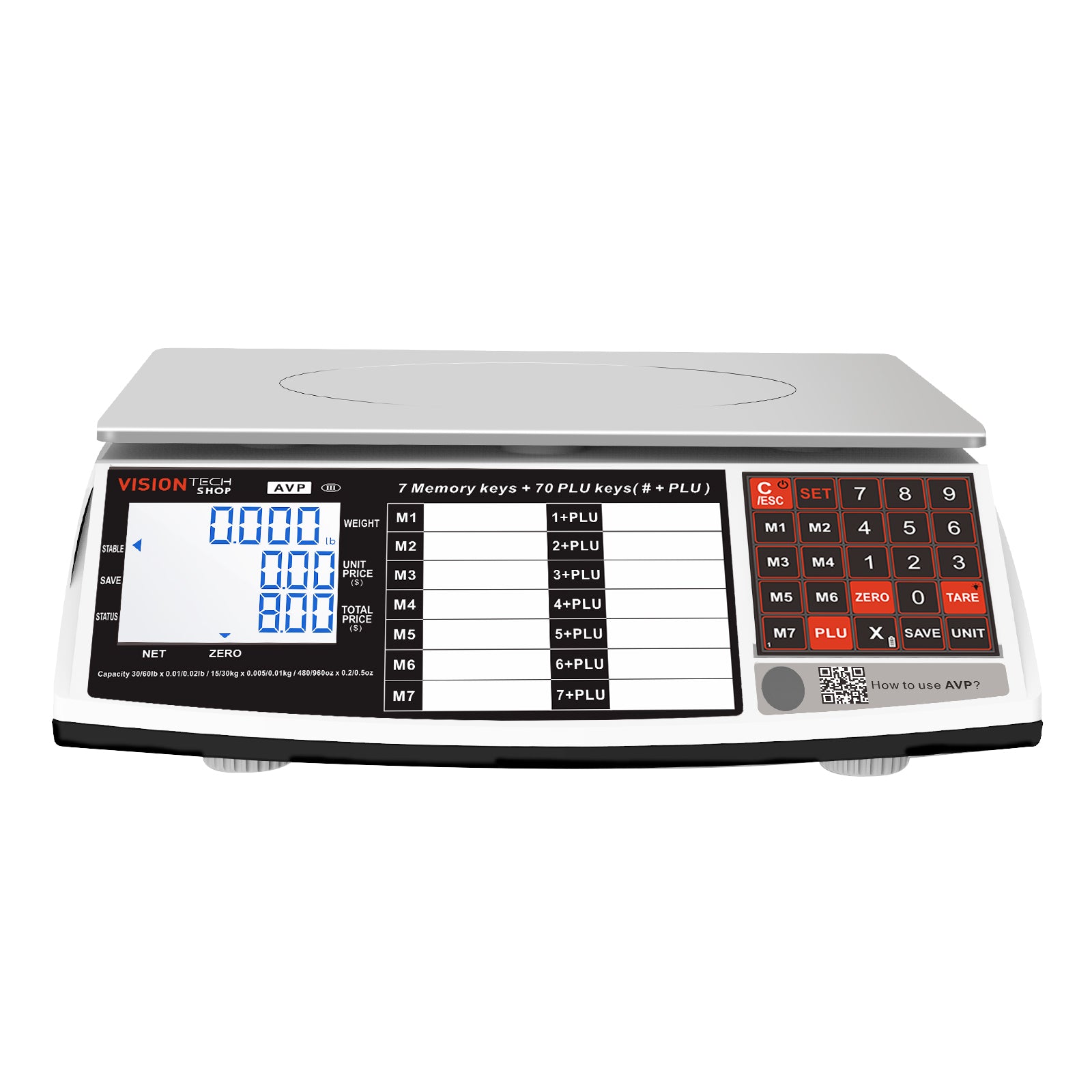 Designed with VisionTechShop reliability, the AVP Price Computing Scale stands alone its field. High accuracy and simple to use. It comes with 7 Memory + 70 Indirect PLU keys, a light touch keyboard with life-long carbon membrane, and a high anti-interference design.