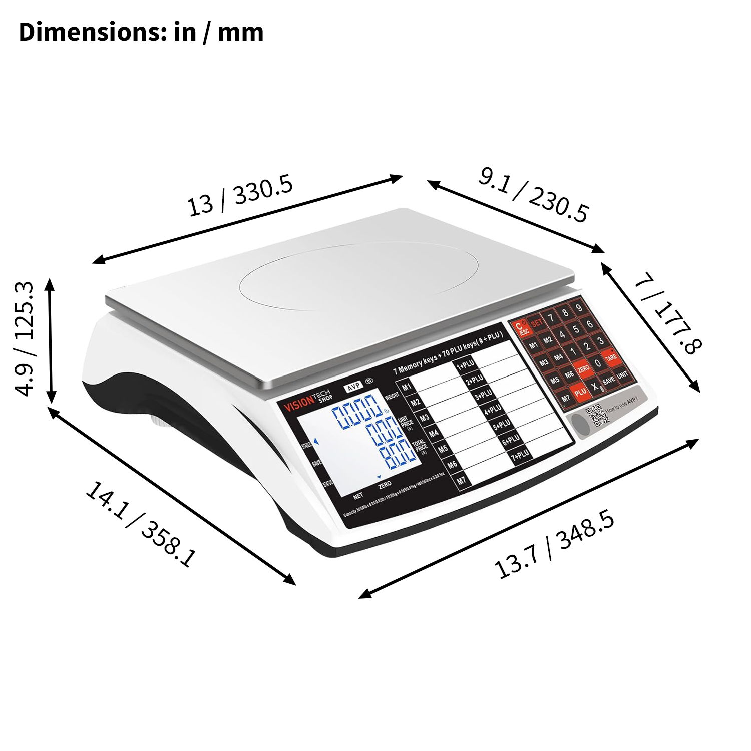 Designed with VisionTechShop reliability, the AVP Price Computing Scale stands alone its field. High accuracy and simple to use. It comes with 7 Direct+ 70 Indirect PLU keys, a light touch keyboard with life-long carbon membrane, and a high anti-interference design.